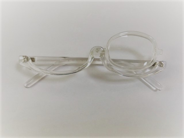 De Make-up bril is speciaal gemaakt om de make up goed te kunnen aanbrengen. Bij een + sterkte is het vervelend om de make-up aan te brengen als het oog niet voldoende meer dan scherpstellen op dichtbij. De Make-up bril heeft een beweegbare lens. 1 oog heeft dus het glas ervoor en de andere kan opgemaakt worden. En dit kun je wisselen per oog, je hoeft alleen het glaasje te draaien naar de andere zijde.