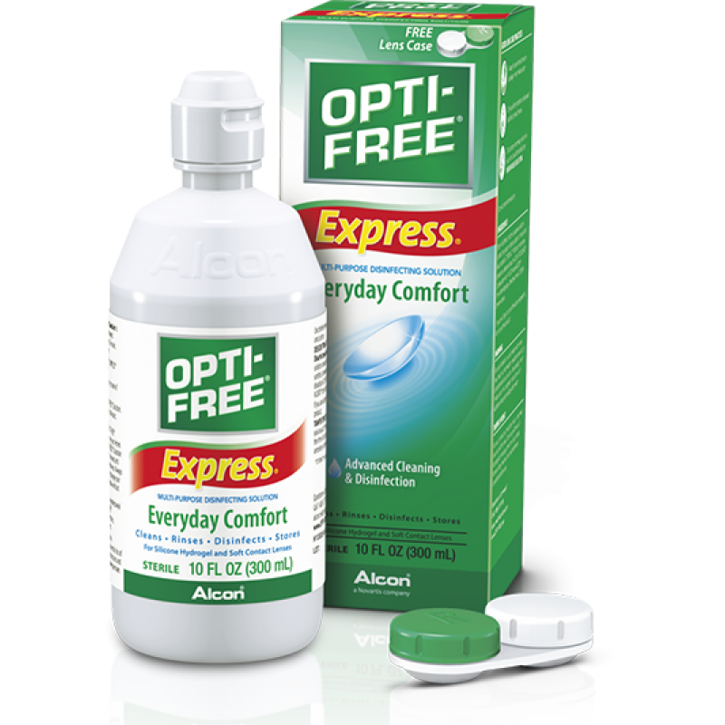 Opti-free Express is een alles-in-1 vloeistof voor het desinfecteren, reinigen, afspoelen, bevochtigen en bewaren van alle zachte contactlenzen.